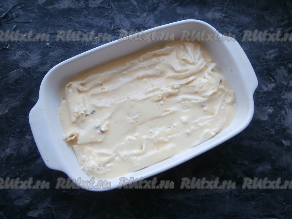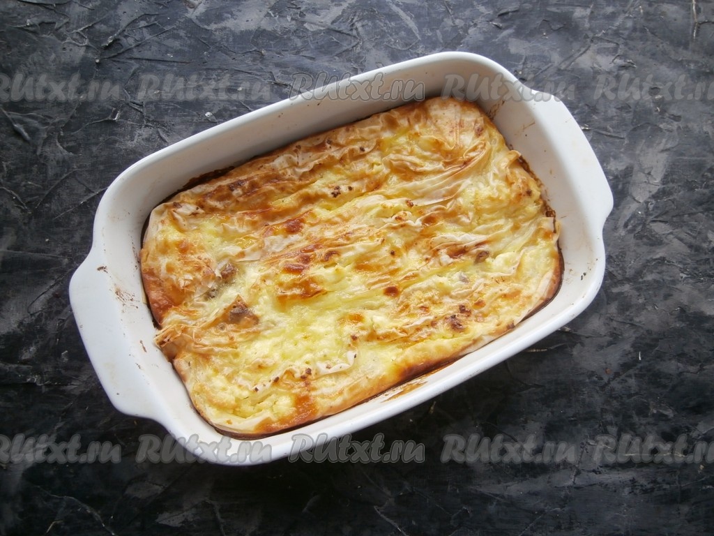 Залить полученной смесью тесто фило в форме так, чтобы заливка попала и между листами теста.