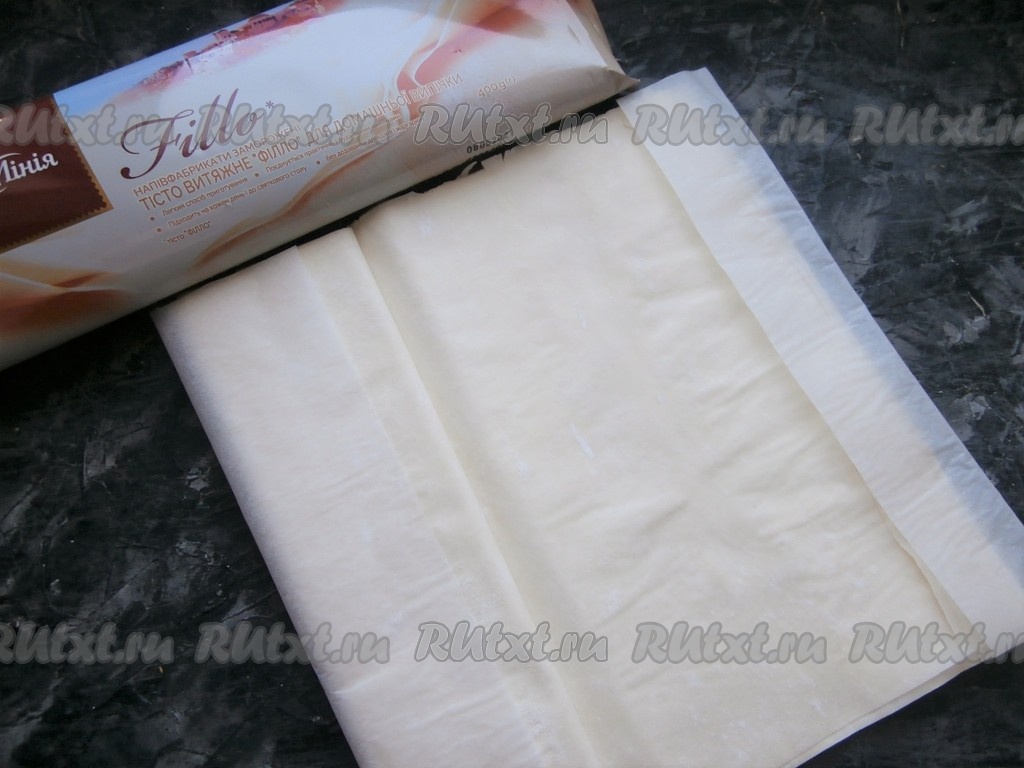 Упаковку теста фило разморозить в течение 2 часов, открыть, развернуть листы. Для моей формы 23 см х 15 см понадобилось 3 листа теста. Не использованное тесто нужно снова завернуть, поместить в упаковку и убрать в морозилку.