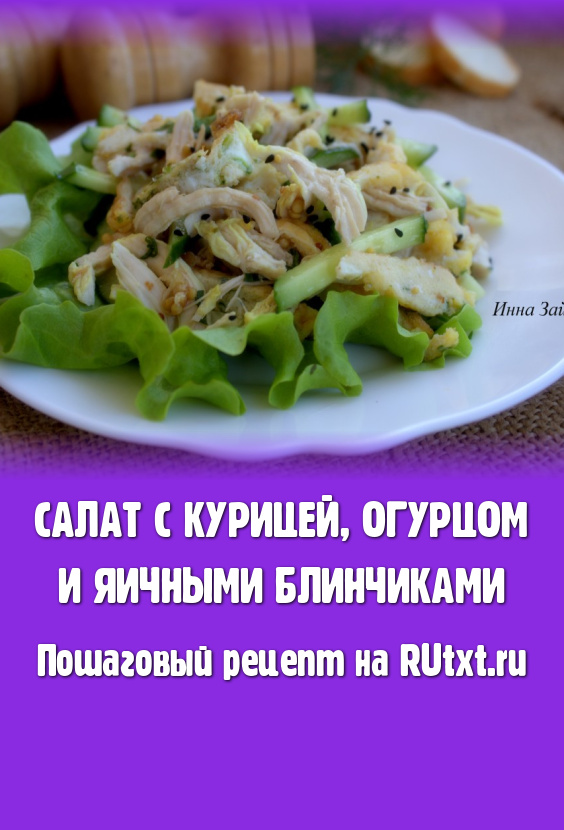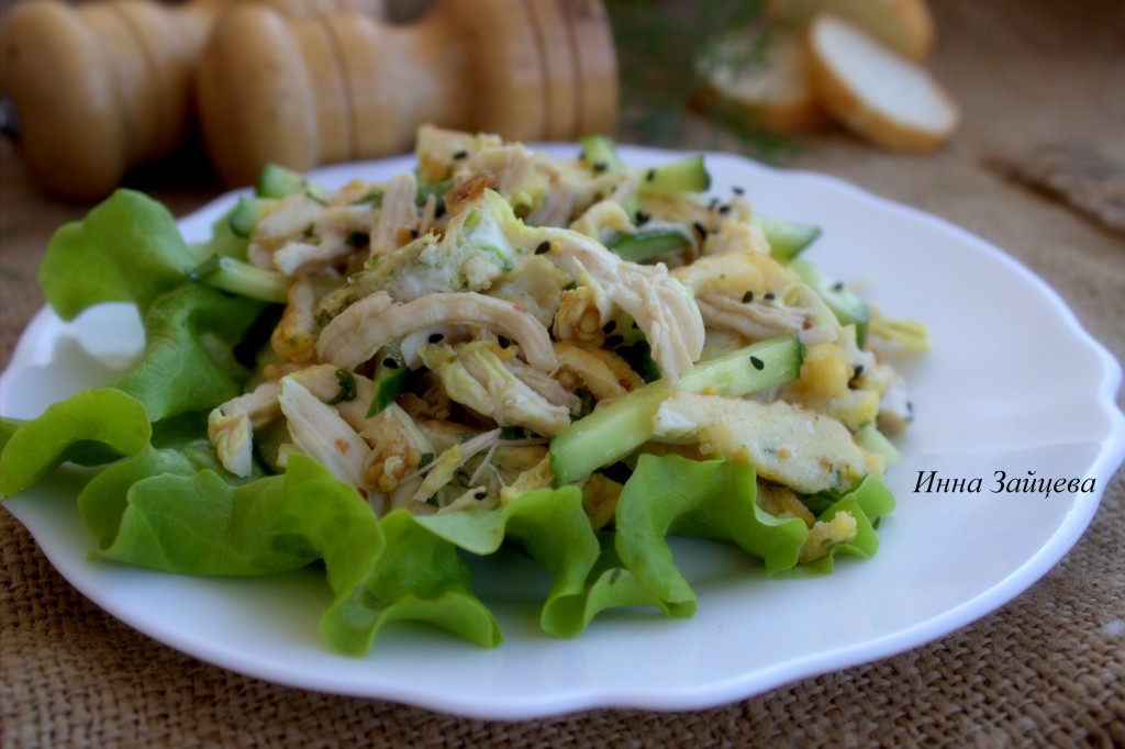 Вот такой аппетитный, сытный салат из яичных блинчиков с курицей и огурцом у нас получился. Перед подачей я посыпала салат чёрным кунжутом, подсушенным на сухой сковороде.