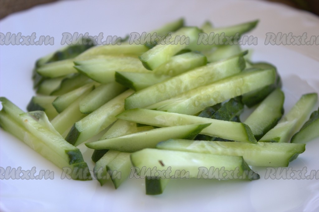 Свежий огурец вымыть, нарезать на тонкие брусочки.