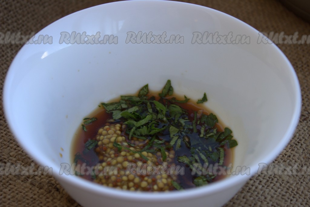 Для приготовления заправки в тарелке соединить соевый соус, оливковое масло, добавить горчицу в зёрнах, сахар, очищенный и пропущенный через пресс чеснок (я использовала сушёный чеснок) и нарезанную мелко петрушку. По желанию, можно положить бальзамический уксус и любимые специи. Хорошо перемешать заправку.