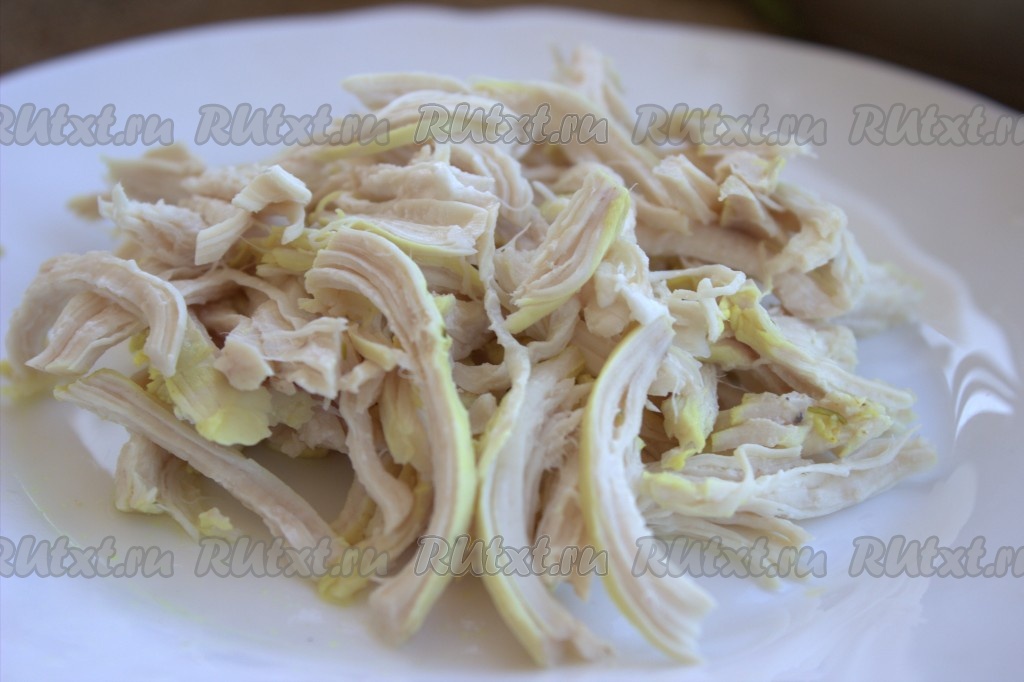 Готовое куриное мясо полностью охладить, а затем порвать на волокна.