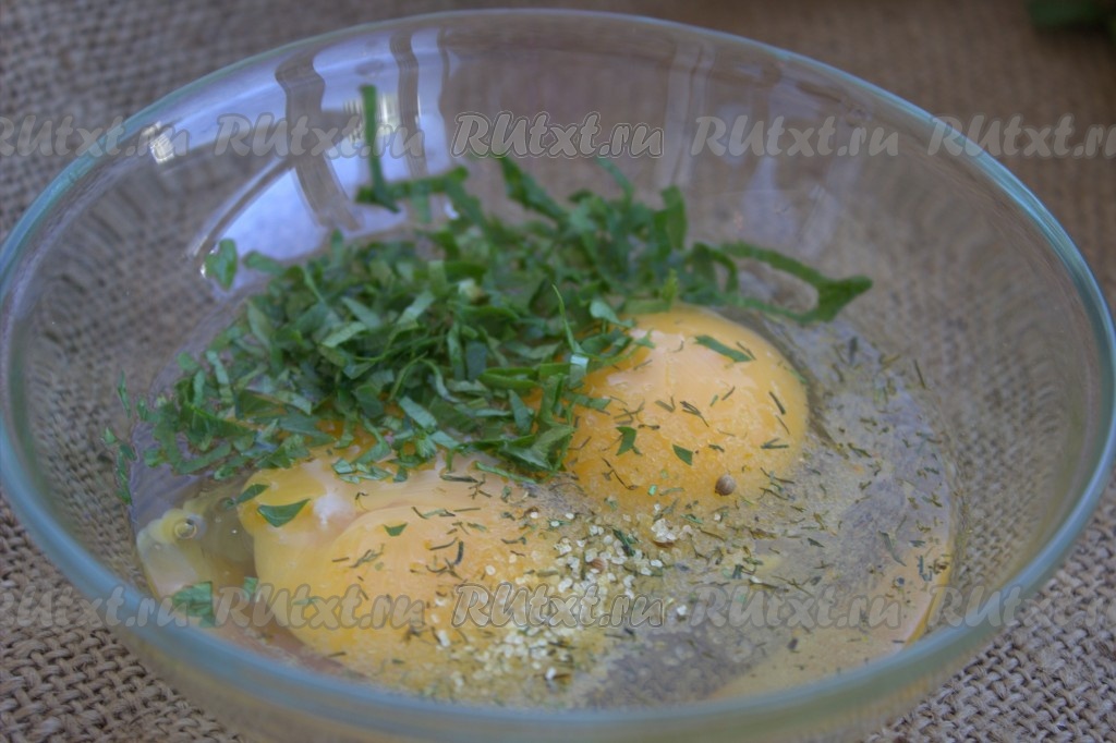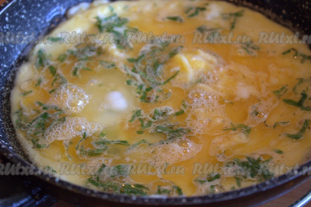 Тем временем приготовить яичный блинчик, для этого необходимо в миску вбить яйца, добавить мелко рубленную зелень, посолить, приправить по вкусу.