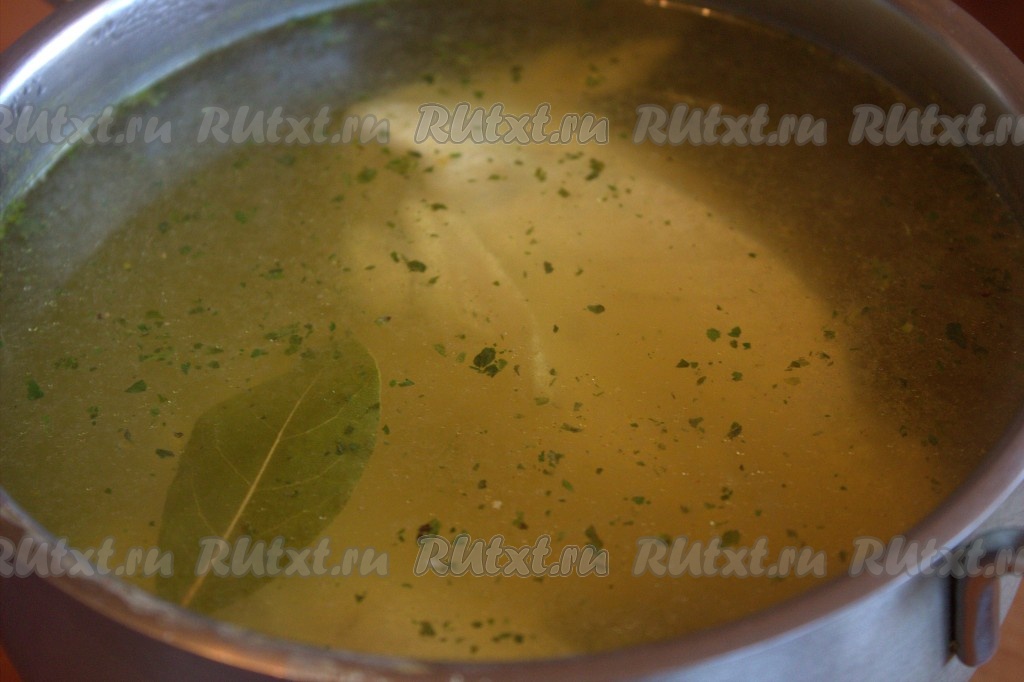 Куриное филе промыть, поместить в кастрюлю с кипящей водой, ещё раз дать закипеть воде, снять пену, посолить, приправить по вкусу (я использовала универсальную овощную приправу), добавить лавровый лист, а после этого варить на минимальном огне минут 20-25 (до готовности).