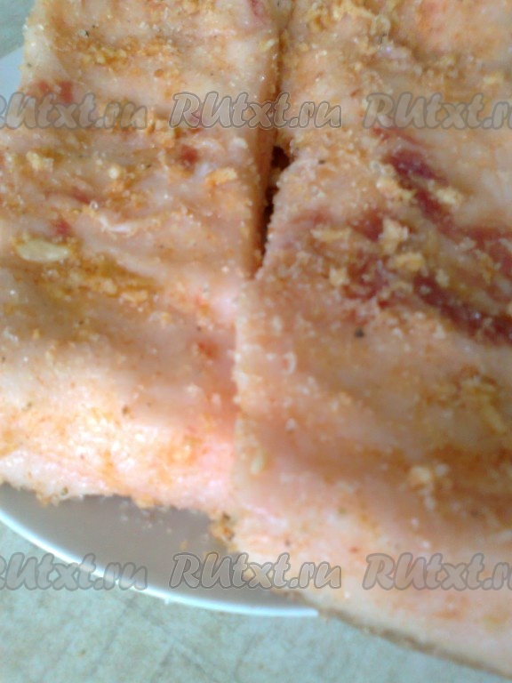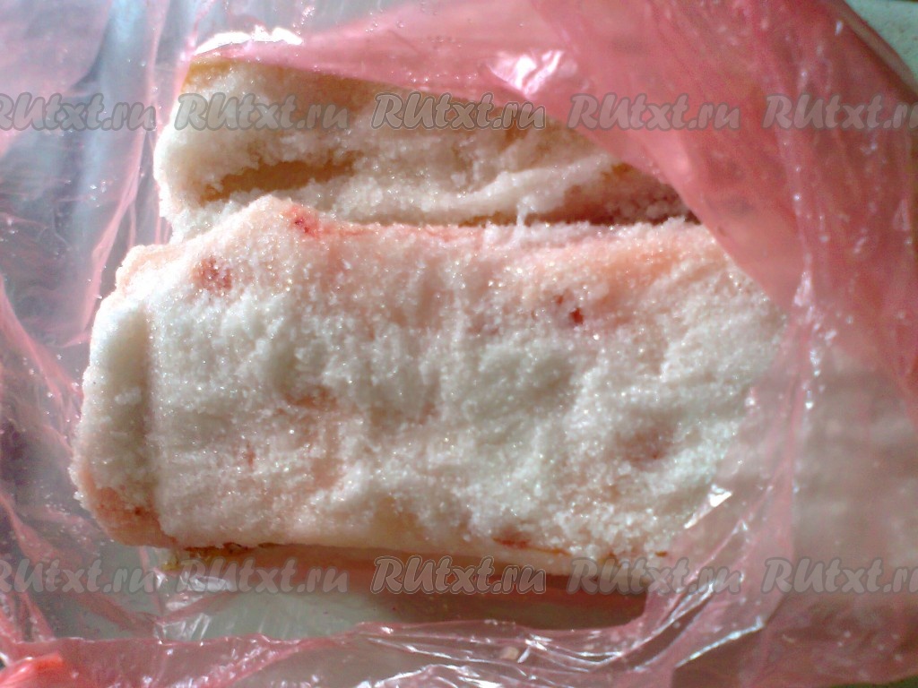 Если кусок сала широкий, то его надо нарезать на куски шириной 7-9 см. Далее куски сала надо обсыпать сахаром со всех сторон и выложить в пакет, который не пропускает жидкость (или в контейнер с крышкой). Сахар вытянет всю жидкость из сала, жидкость останется в пакете, а сало станет более плотным.