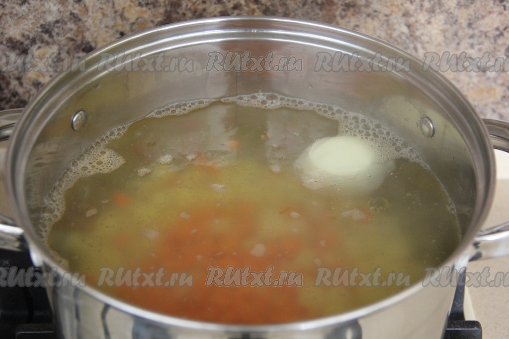 В кастрюлю влить 2,5 литра воды и довести на сильном огне до кипения. В кипящую воду опустить целую очищенную луковицу и нарезанную картошку, варить с момента закипания на небольшом огне 5 минут.