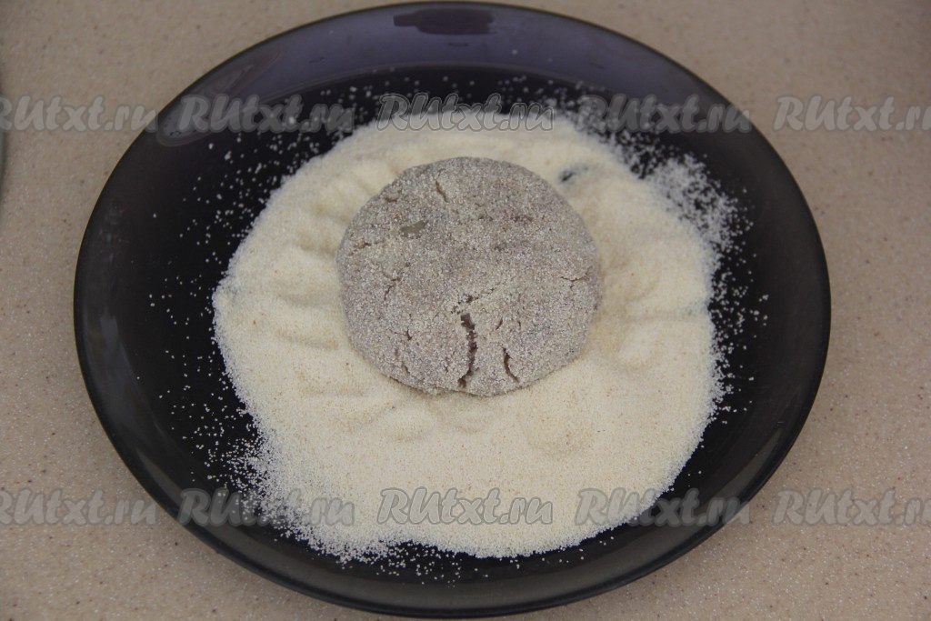 Манку (или муку) всыпать в плоскую тарелку, из фарша сформировать котлеты и обвалять их в манке (или муке).