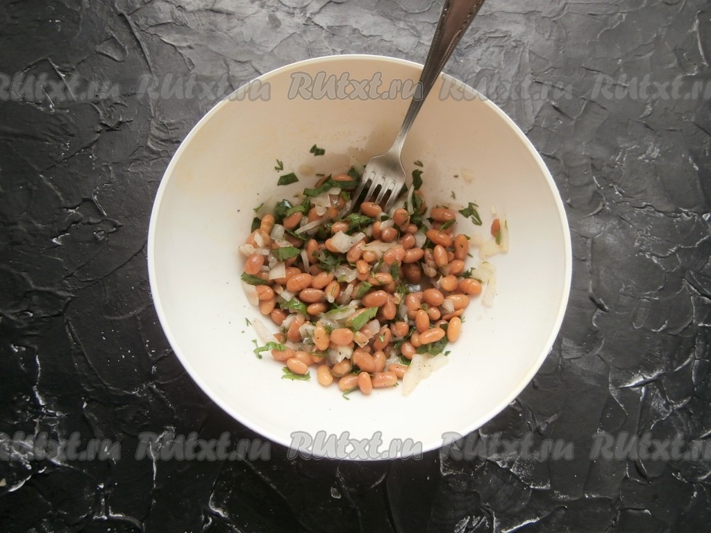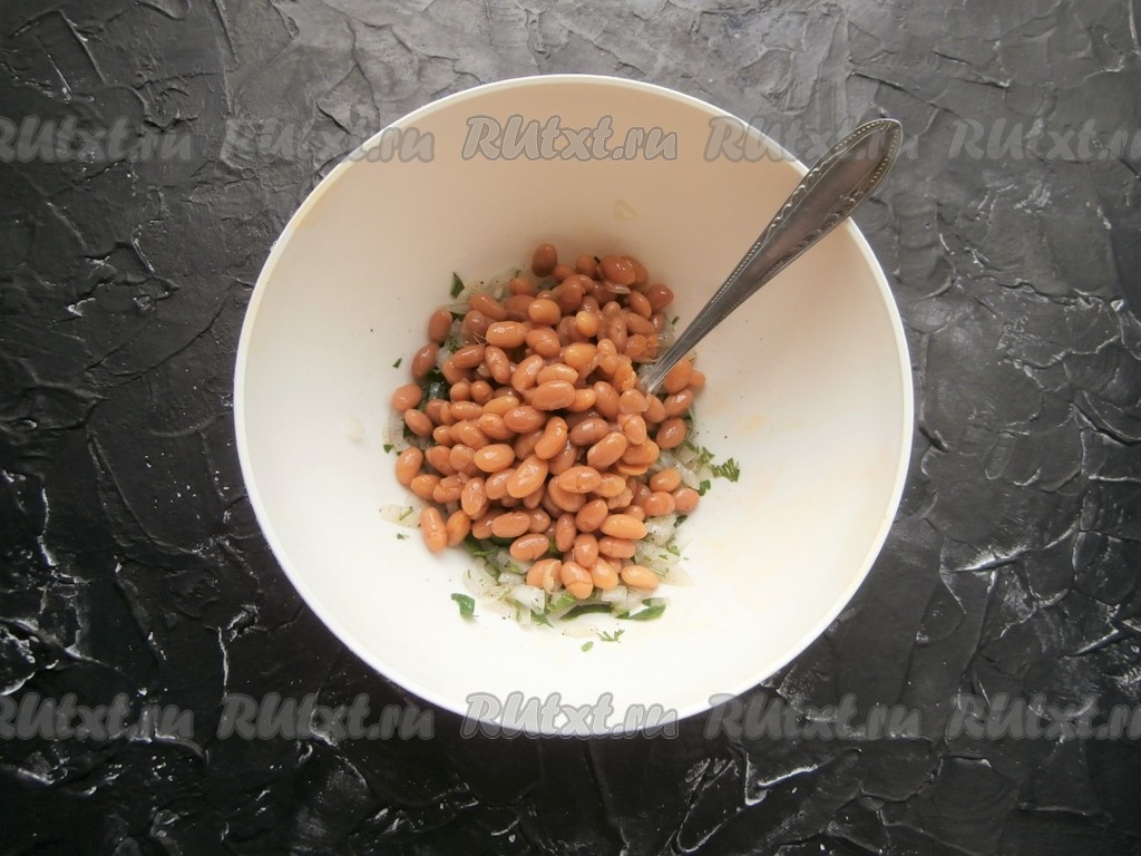 Далее добавить в миску с маринованным луком отварную (или консервированную без жидкости) фасоль.