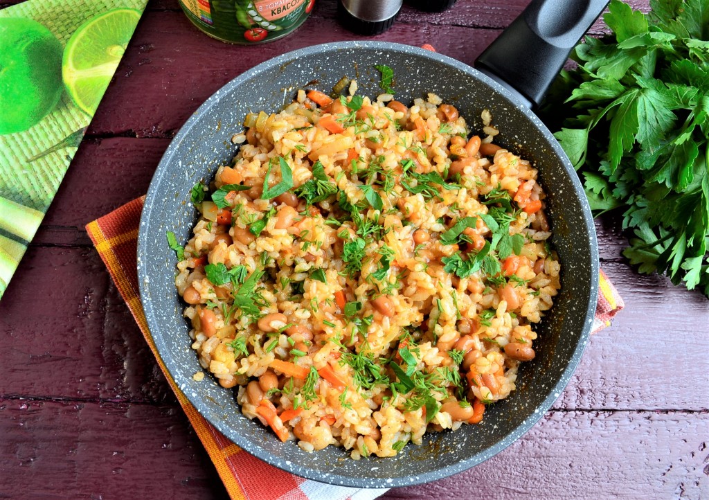 Подавать очень вкусный, аппетитный рис, приготовленный с консервированной фасолью в томатном соусе, горячим.