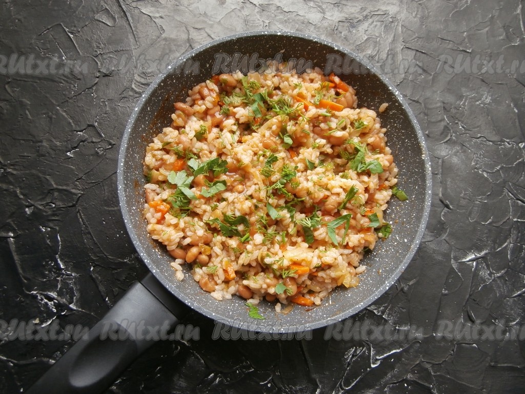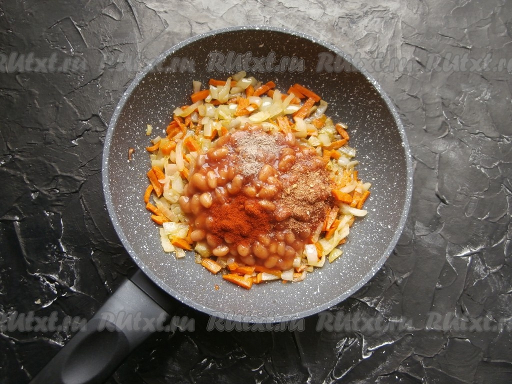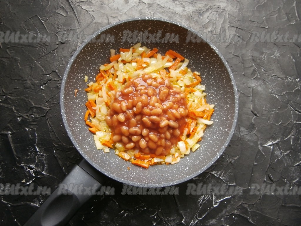 Лук с морковкой обжарить на среднем огне до мягкости (в течение 4-5 минут) на среднем огне, добавить фасоль.