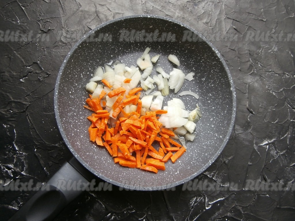 Лук, чеснок, морковь очистить. Луковицу нарезать произвольными кусочками, морковь - брусочками (или соломкой), выложить их в сковороду с растительным маслом.