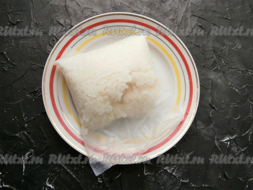 Рис отварить до готовности. У меня рис в пакетике варился 20 минут в кипящей подсоленной воде. Если у вас рис рассыпной, тогда промойте его, выложите в кастрюлю с холодной водой (воды должно быть в 2 раза больше, чем риса), поставьте на огонь и варите с момента закипания минут 20 на небольшом огне (рисинки должны стать мягкими, но не должны развариться), затем промойте рис в горячей воде, дождитесь, чтобы стекла лишняя жидкость.
