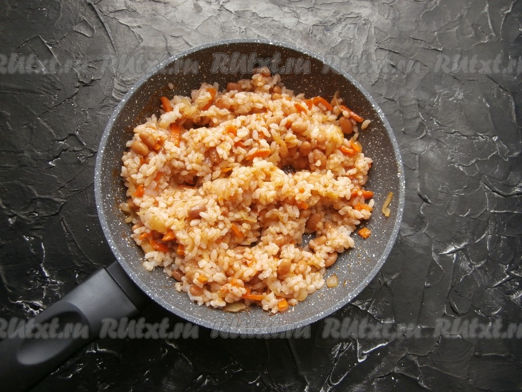 Выложить в сковороду сваренный рис, перемешать и прогреть на небольшом огне около 3-4 минут, убрать с огня.