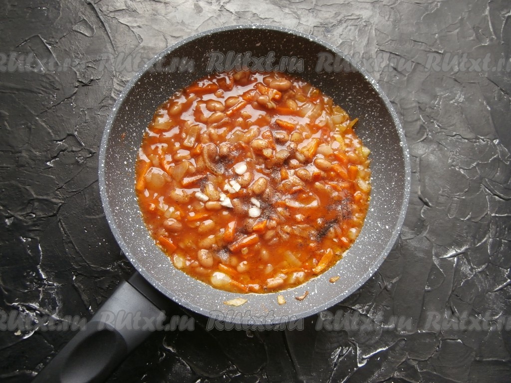 Перемешать фасоль с луком и морковью, протушить несколько минут, всыпать немного чёрного молотого перца, соль, сахар, добавить измельчённый чеснок.