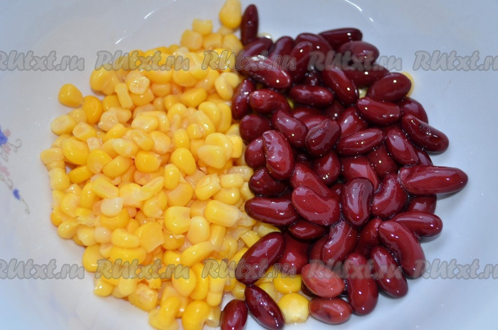 С фасоли и кукурузы слить жидкость, высыпать в салатник.