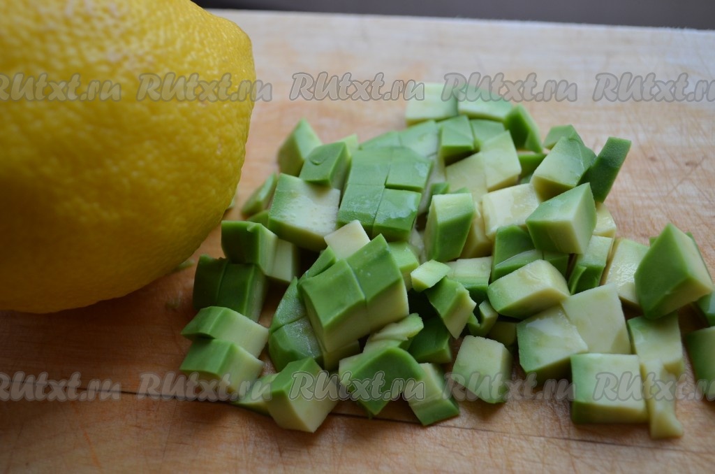 Авокадо очистить, мякоть нарезать кубиками, сбрызнуть лимонным соком.
