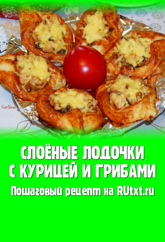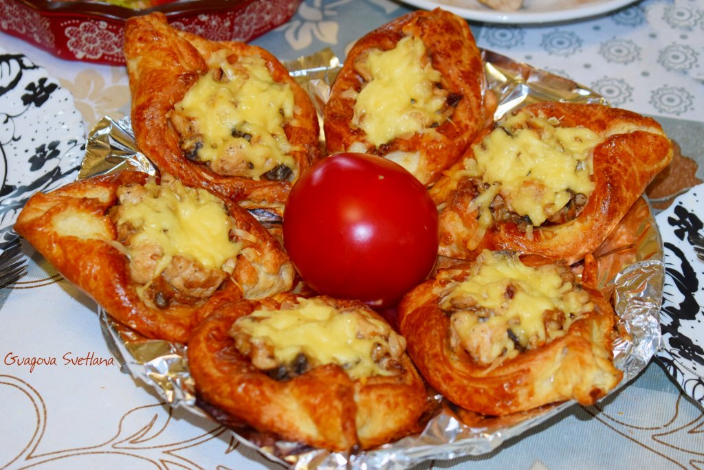 Ароматные, сочные, нежные и такие хрустящие лодочки из слоёного теста с грибами и курицей подаём к столу в качестве горячей закуски. Поверьте, это очень вкусно! Непременно попробуйте!