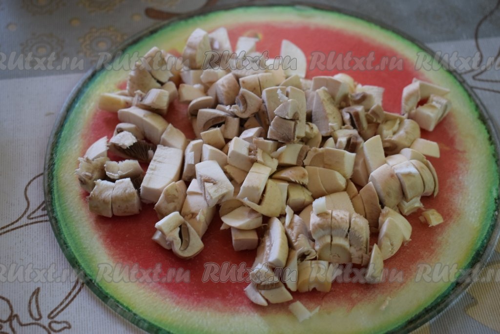 Шампиньоны очищаем от кожицы (вместо шампиньонов можно взять и предварительно отваренные в течение 25-30 минут лесные грибы) и нарезаем на мелкие кубики.