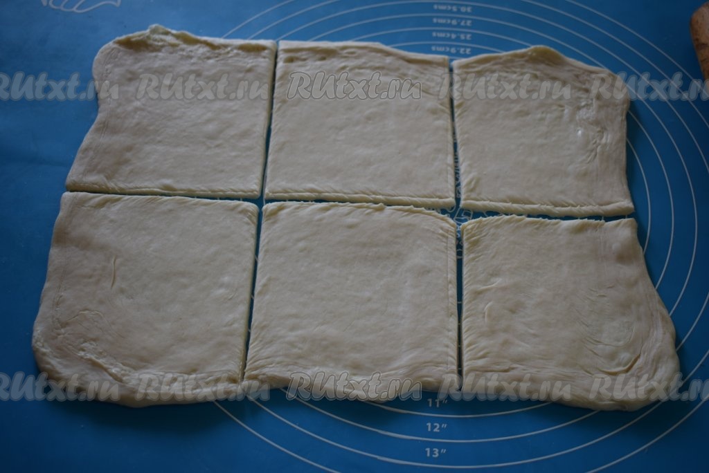 Слоёное дрожжевое тесто размораживаем. Для этой закуски нам потребуется 1 лист слоёного теста, слегка раскатываем его на припылённой мукой поверхности.