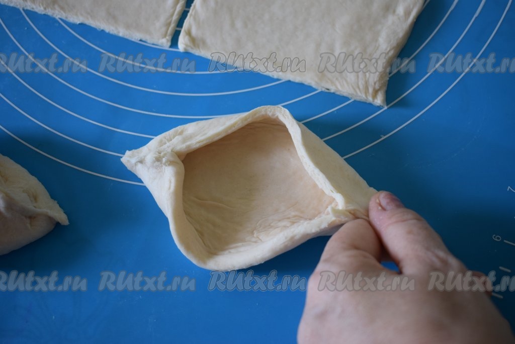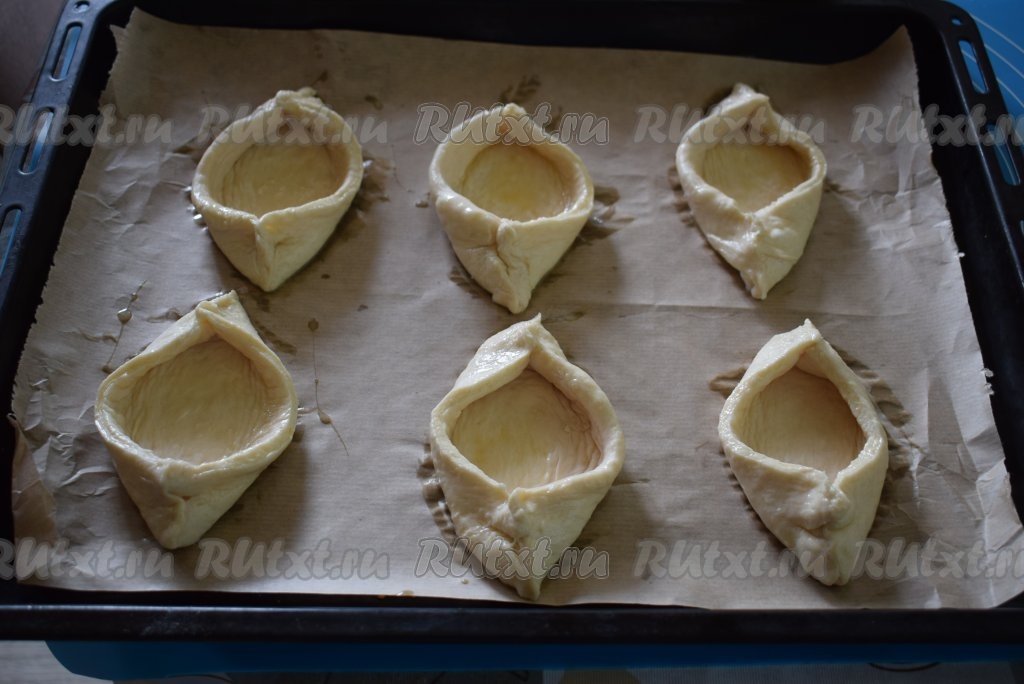 Сформированные лодочки аккуратно перекладываем на противень, застеленный пергаментом. Лодочки выкладываем на расстоянии друг от друга. Смазываем поверхность лодочек сырым яйцом, предварительно взбитым до однородности с помощью вилки.