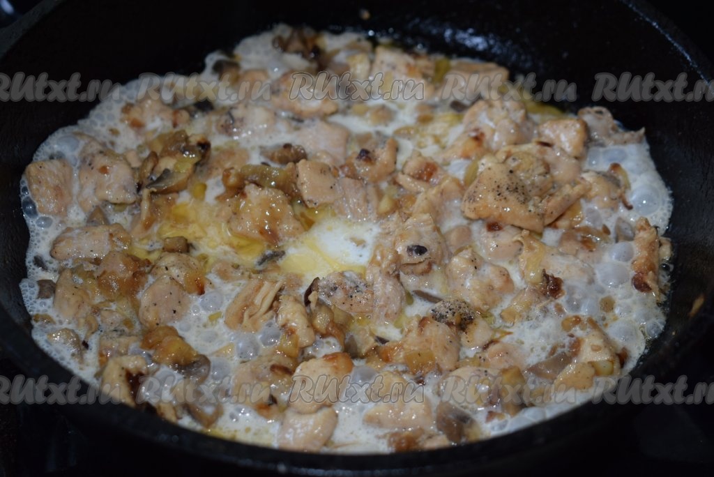 Вливаем в сковороду сливки и добавляем кусочек сливочного масла, тушим курицу с грибами на медленном огне, примерно, 6-7 минут.