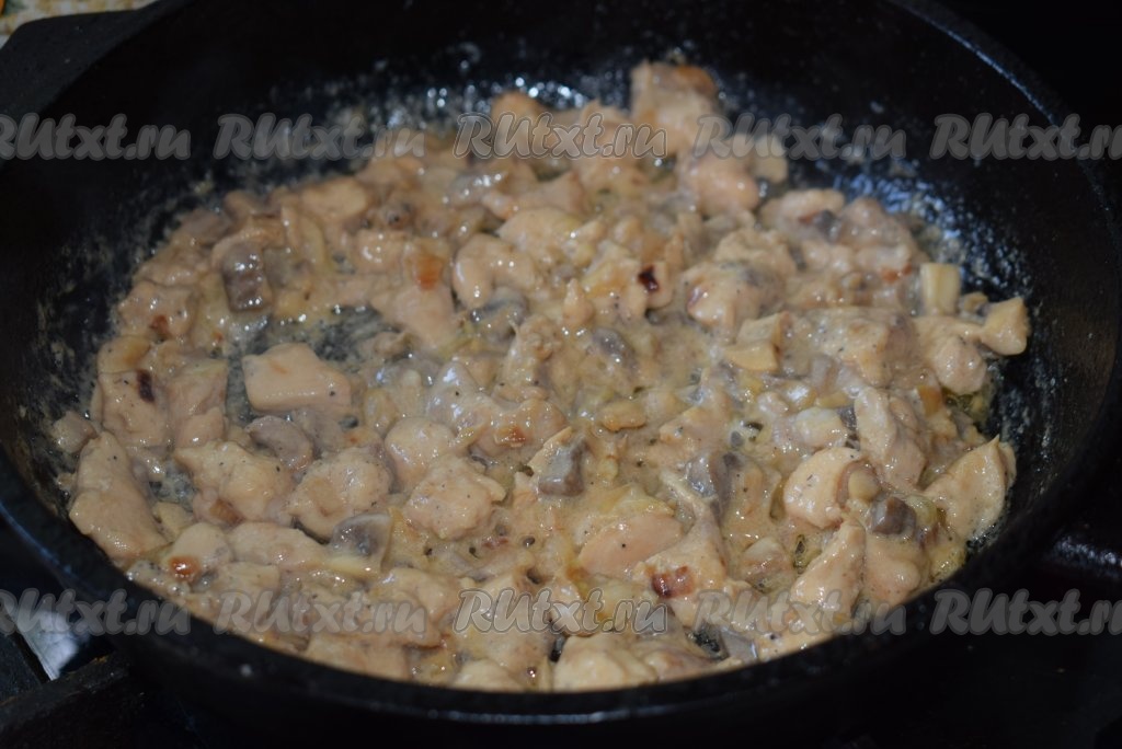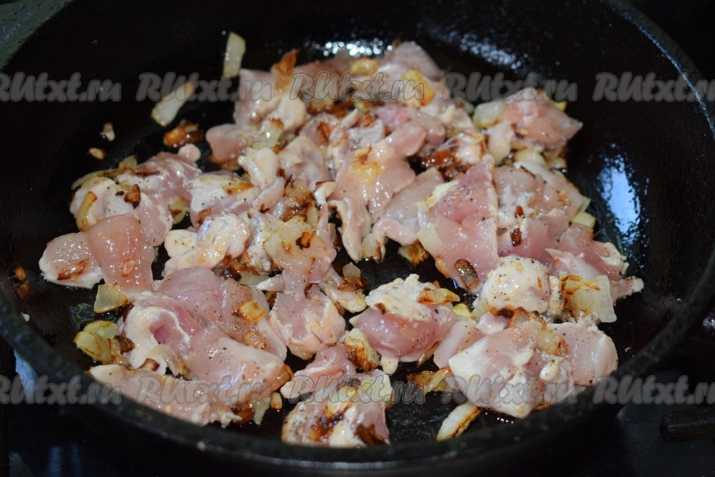 Обжариваем лук, помешивая, до золотистости (примерно, 5-6 минут) на среднем огне, затем добавляем нарезанное куриное филе и обжариваем, примерно, 7-8 минут. Для того чтобы мясо с луком не пригорели, не забывайте периодически перемешивать.