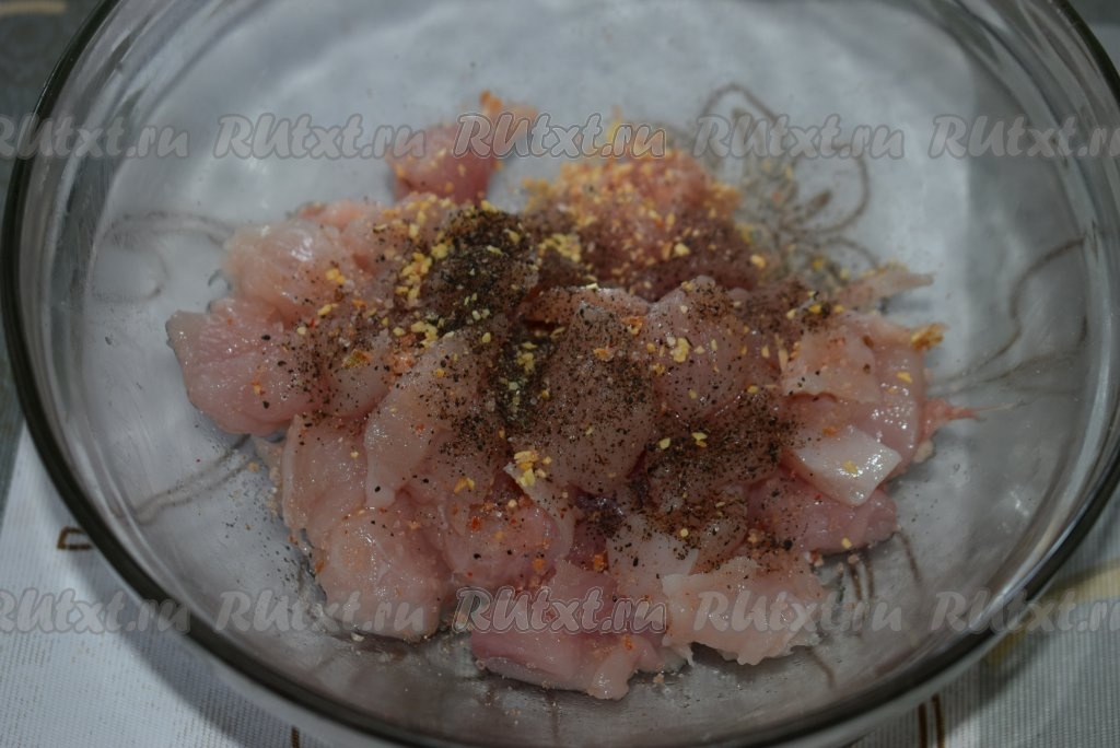 Пока лодочки остывают, займёмся начинкой. Для этого куриное филе нарезаем достаточно мелко, затем перчим, солим и добавляем любимые специи.