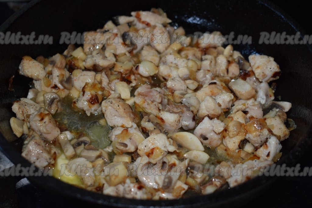 Добавляем к курице с луком грибы и жарим ещё минут 5, солим и перчим содержимое сковороды по вкусу.