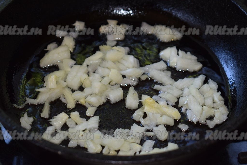 Мелко нарезаем очищенную луковицу и выкладываем её в разогретую с растительным маслом сковороду.