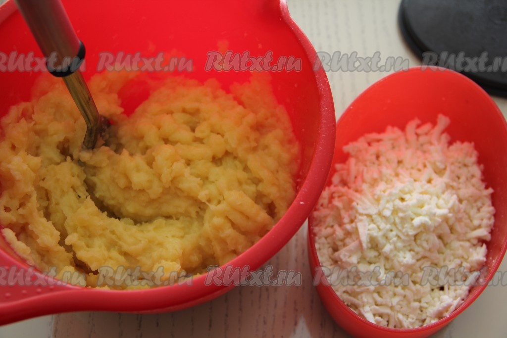 Измельчить картофель толкушкой в пюре. Чтобы запеканка была со сливочным вкусом можно в картофельное пюре добавить, по желанию, натёртый мягкий сыр (у меня адыгейский) и перемешать.