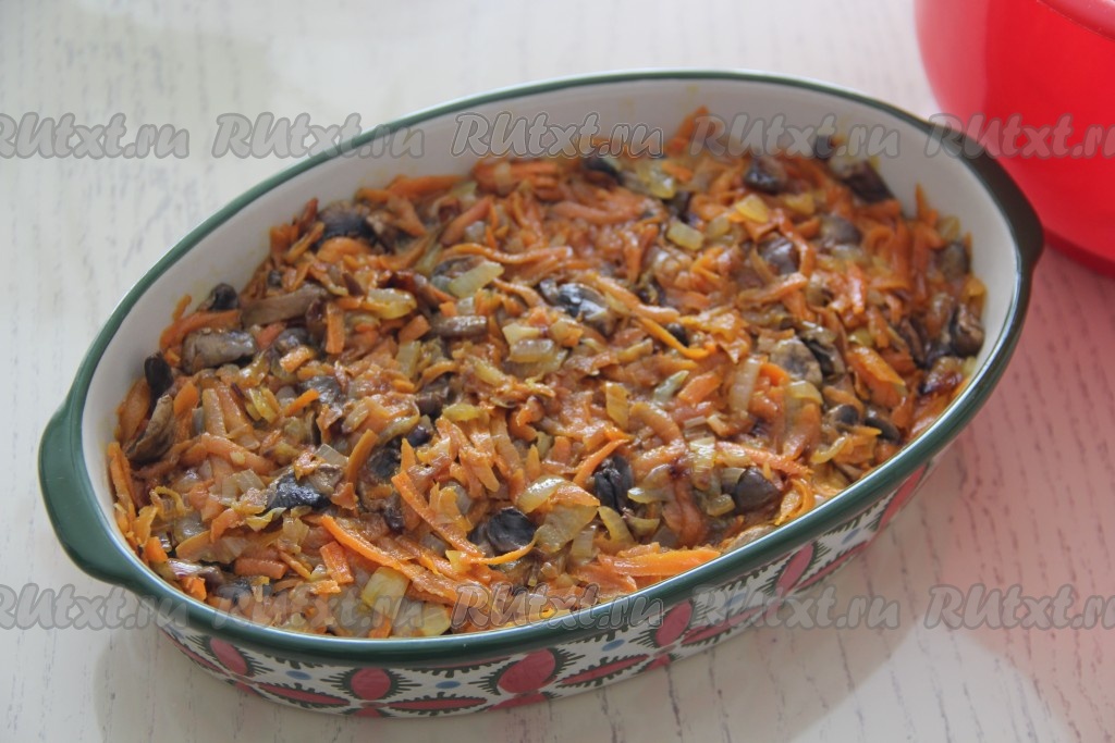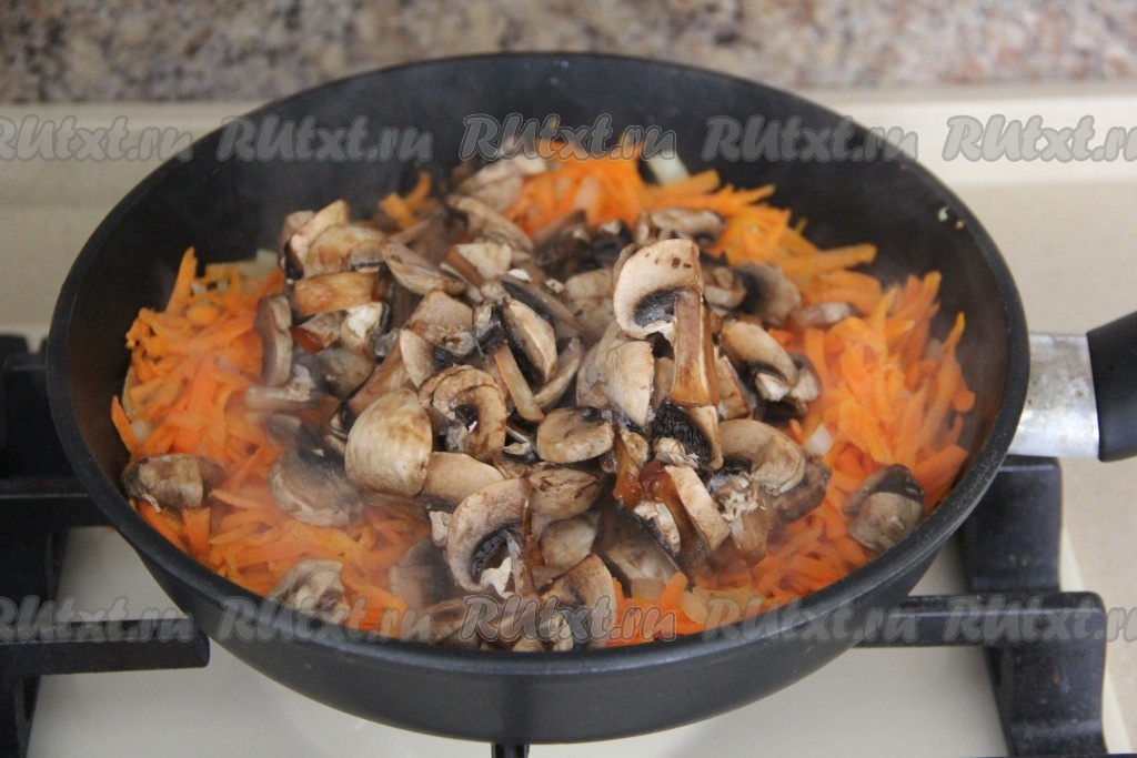 Обжарить овощи в течение 5 минут. Далее добавить шампиньоны. Я использовала замороженные шампиньоны, нарезанные на дольки, предварительно я их не размораживала (если шампиньоны свежие, тогда промойте их и нарежьте на пластинки). Обжаривать грибы с овощами 10-15 минут (до выпаривания жидкости из шампиньонов), помешивая время от времени. В процессе обжаривания посолить, сдобрить специями, перемешать. Готовые шампиньоны, обжаренные с овощами, снять с огня и дать немного остыть.