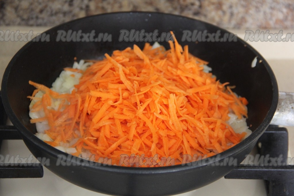 Обжарить лук до прозрачности, не забывая иногда перемешивать, на среднем огне (на это потребуется 4-5 минут), после этого добавить натёртую морковку.