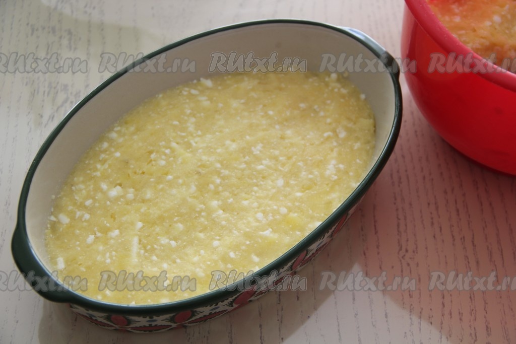Разделить картофельное пюре на две части. В жаропрочную форму выложить одну часть картофельного пюре и разровнять.