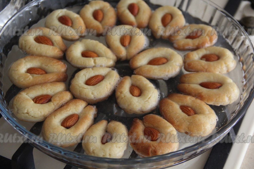 Переложить печенье в форму и аккуратно полить его горячим сиропом. Печенюшки должны быть в сиропе на половину. Оставить печенье с миндалём в сиропе на ночь.