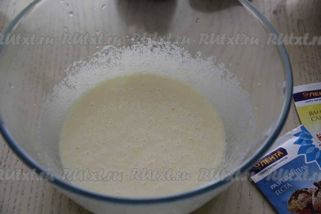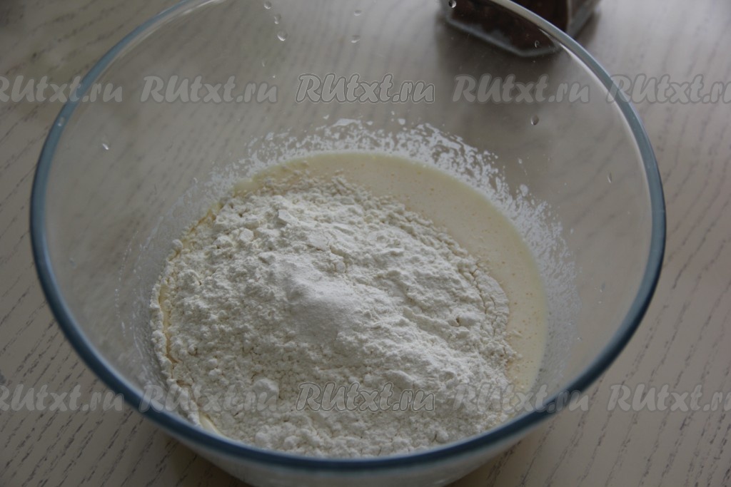 Всыпать муку, ванильный сахар, соль и разрыхлитель.
