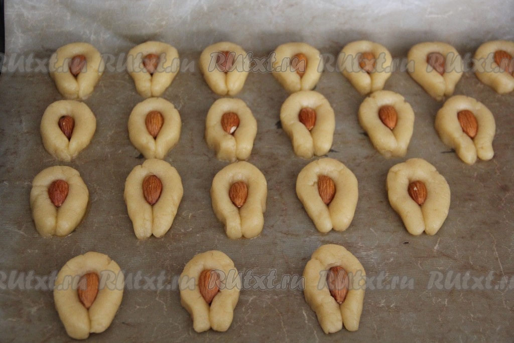 Выложить печенье с миндалём на противень, застеленный пергаментом. Желательно выкладывать заготовки не слишком близко друг к другу.