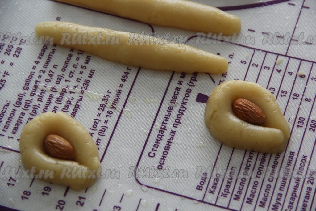 Из каждой колбаски сформировать подковку, в середину выложить миндаль (как на фото).
