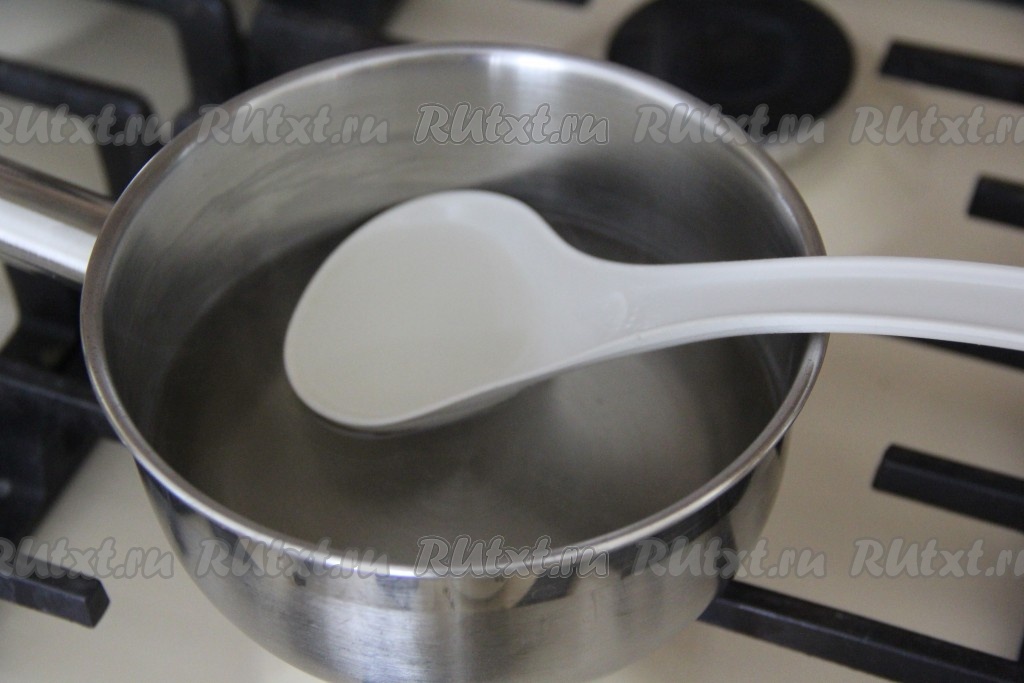 Для приготовления сиропа соединить в сотейнике воду и сахар, поставить на огонь, после закипания проварить на небольшом огне до полного растворения сахара (около 2-3 минут), снять с огня и слегка остудить сахарный сироп.