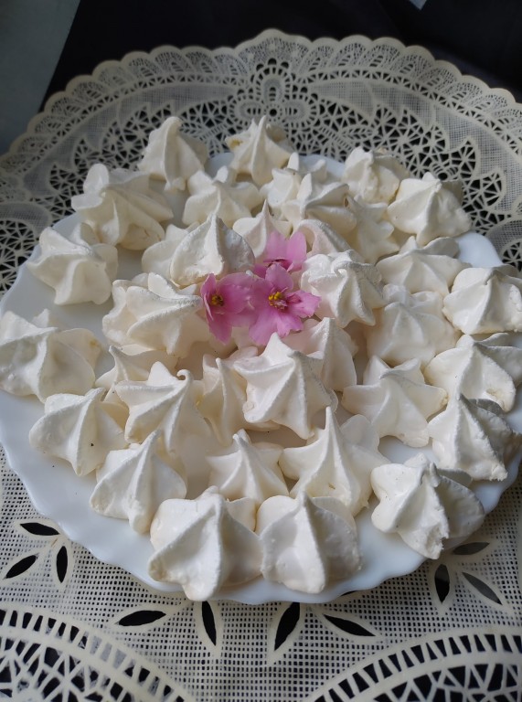 Духовку разогреваем до 130 градусов. Сушим в духовке при температуре 120 градусов около 20 минут, снижаем температуру до 100 градусов и сушим ещё 20-40 минут (в зависимости от размера безе). После выпечки оставляем безе в духовке до полного остывания. Вот такое безе из сухого яичного белка (альбумина) получилось.