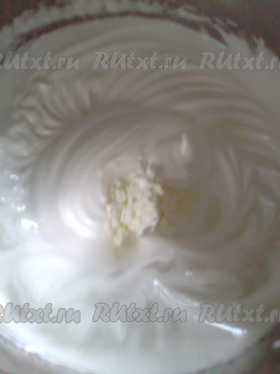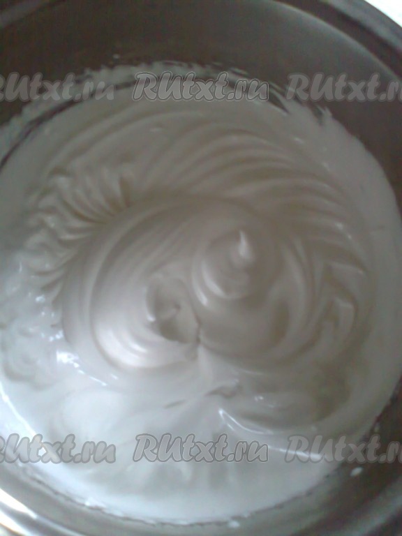 Затем выливаем разведённый порошок в посуду для взбивания и начинаем взбивать миксером. Взбиваем сначала на маленькой скорости до образования пены (в течение 2 минут). Затем скорость увеличиваем и взбиваем на средней скорости до гладкой пены (около 3 минут) и на максимальной скорости до мягких пиков (на это потребуется ещё около 1-2 минут). Масса увеличивается в объёме в несколько раз. Отмеряем сахар. Добавляем его по 1 столовой ложке в несколько приёмов, не переставая взбивать миксером. Взбиваем ещё около 5 минут, пока готовая масса не станет глянцевой.