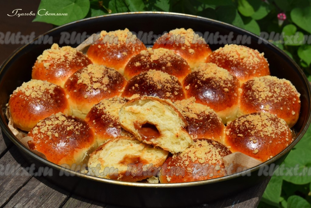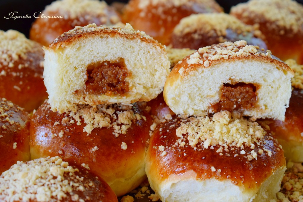 Готовые румяные, красивые и ароматные булочки с начинкой из конфет "Коровка" достаём из духовки.