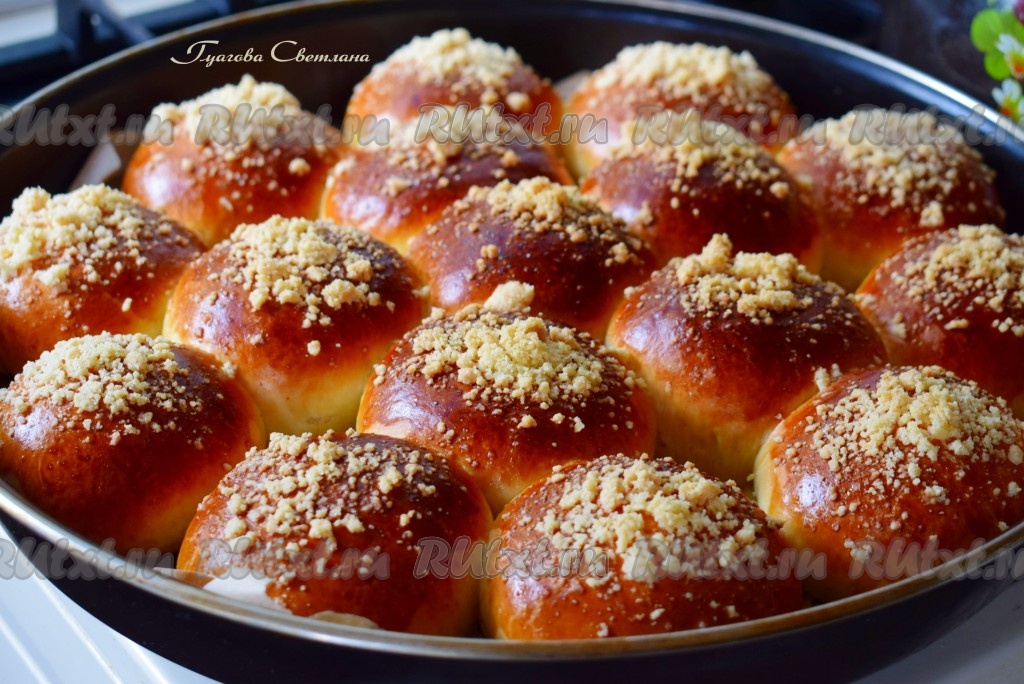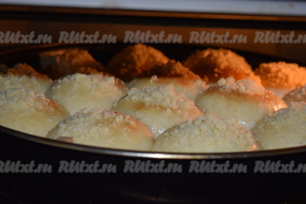 Подошедшие булочки смазываем взбитым вилкой яйцом и сверху посыпаем охлаждённым штрейзелем.