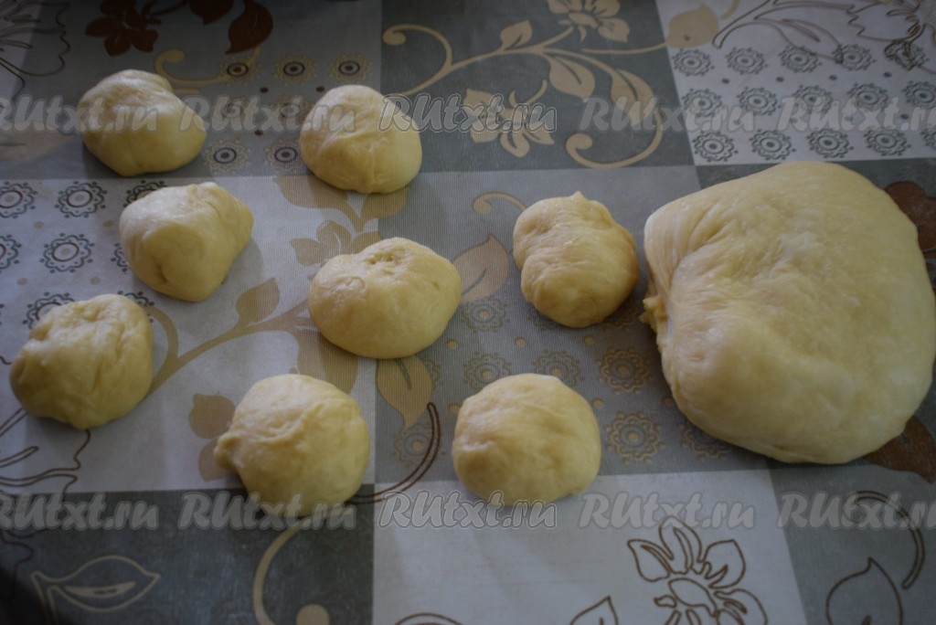 Подошедшее дрожжевое тесто аккуратно вынимаем из миски. Стараемся сильно его не обминать, пусть оно останется воздушным. Разделяем тесто пополам и каждую половину делим на 8, примерно, равных кусочков (из теста у нас получатся, примерно, 16 равных кусочков).