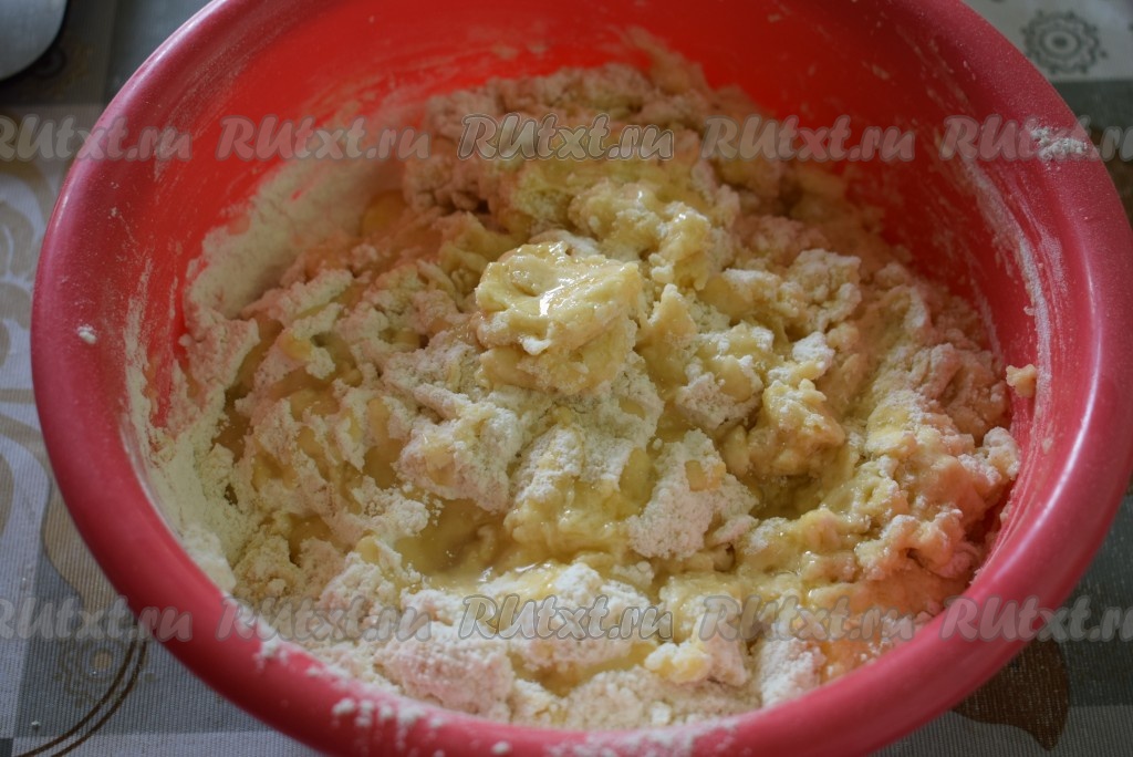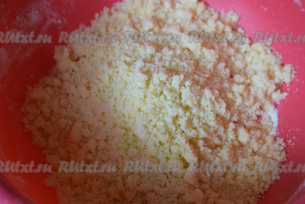 Далее тщательно перетираем руками муку с сахаром и маслом в крошку, наш штрейзель готов. Крошка должна получиться мягкой и воздушной. Накрываем миску со штрейзелем и отправляем в холодильник до момента посыпки булочек.