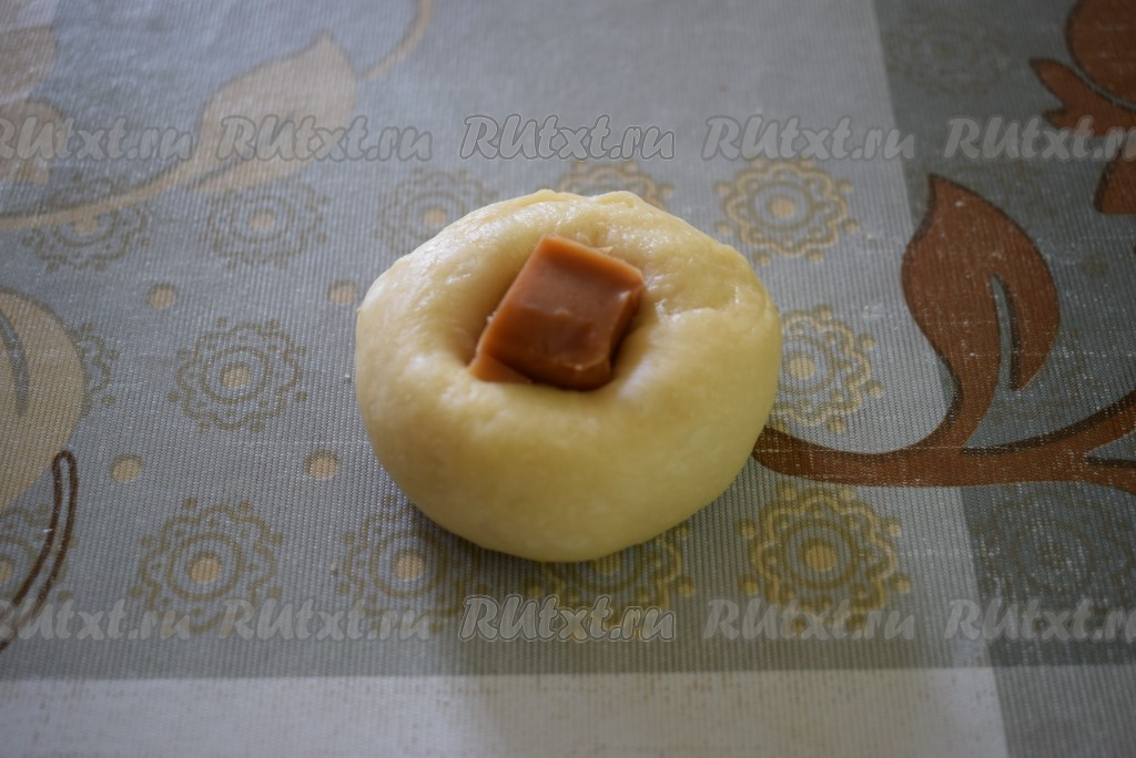 Аккуратно защипываем тесто над конфетой и формируем кругленькую булочку. Таким образом формируем все 16 булочек с начинкой из конфет "Коровка".