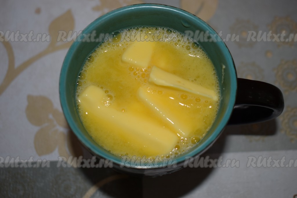 В другую ёмкость нарежем на кусочки сливочное масло, зальём очень тёплой водой, чтобы масло в ней растворилось, тщательно перемешаем масляную смесь.