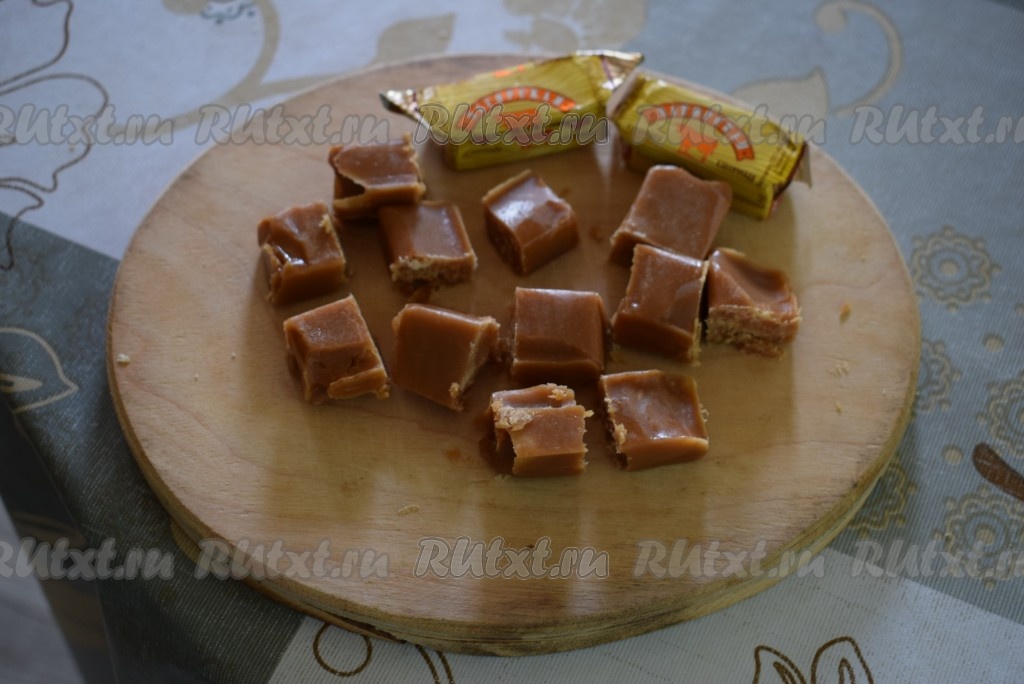 Пока подходит тесто, подготовим нашу начинку. Для этого рецепта подойдут мягкие конфеты сорта "Коровка", так как если вы будете использовать "Коровку", похожую на ириски, то при остывании начинка застынет и булочку будет трудно раскусить. Снимаем с конфет обёртку и разрезаем конфеты пополам, нам понадобится 16 половинок.