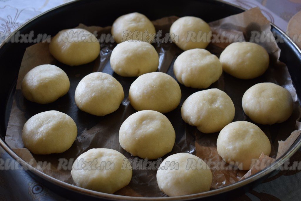 Форму диаметром 42 см застилаем пергаментом, смазанным 1 чайной ложкой растительного масла, и выкладываем на него булочки швом вниз на небольшом расстоянии друг от друга. Накрываем форму с булочками полотенцем и оставляем в тепле на 30-40 минут, чтобы булочки подошли.