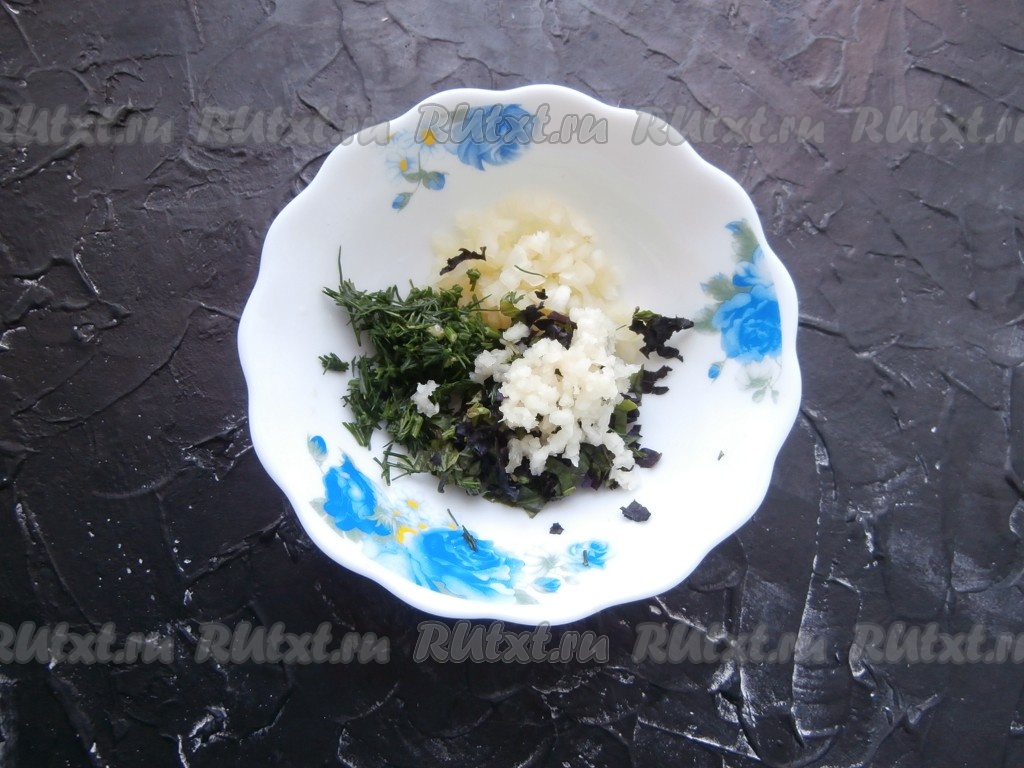 К перцу с базиликом добавить измельчённый укроп и пропущенные через пресс зубчики чеснока.