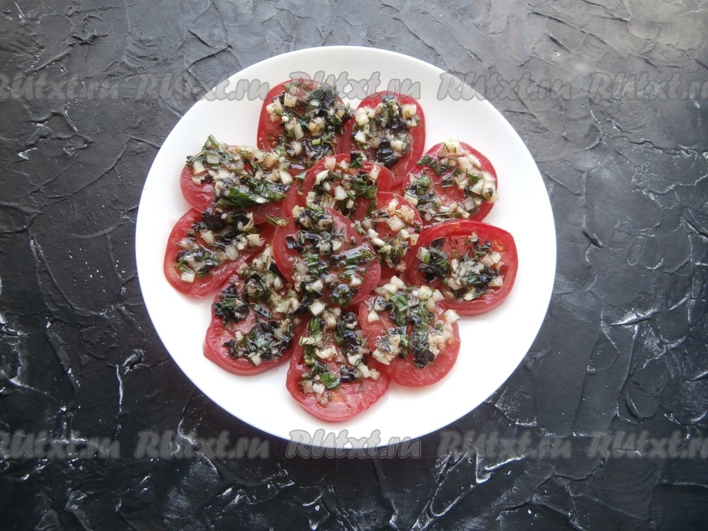 На каждый кружок помидора выложить подготовленную ароматную смесь. Помидоры прикрыть крышкой и поместить в холодильник на 1 час.
